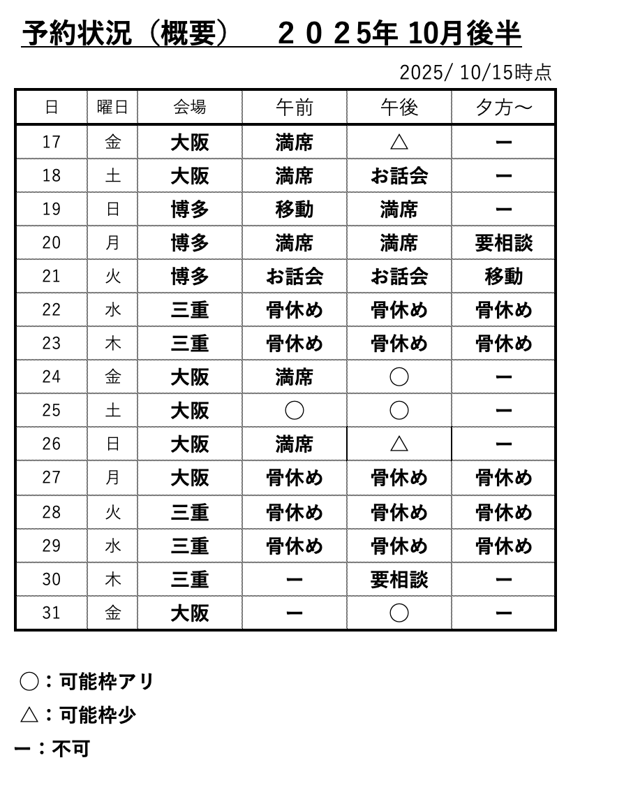 未分類2025.10.15予約状況一覧 10月後半 共有:シェア Facebook で共有するにはクリックしてください (新しいウィンドウで開きます) Facebook クリックして X で共有 (新しいウィンドウで開きます) X