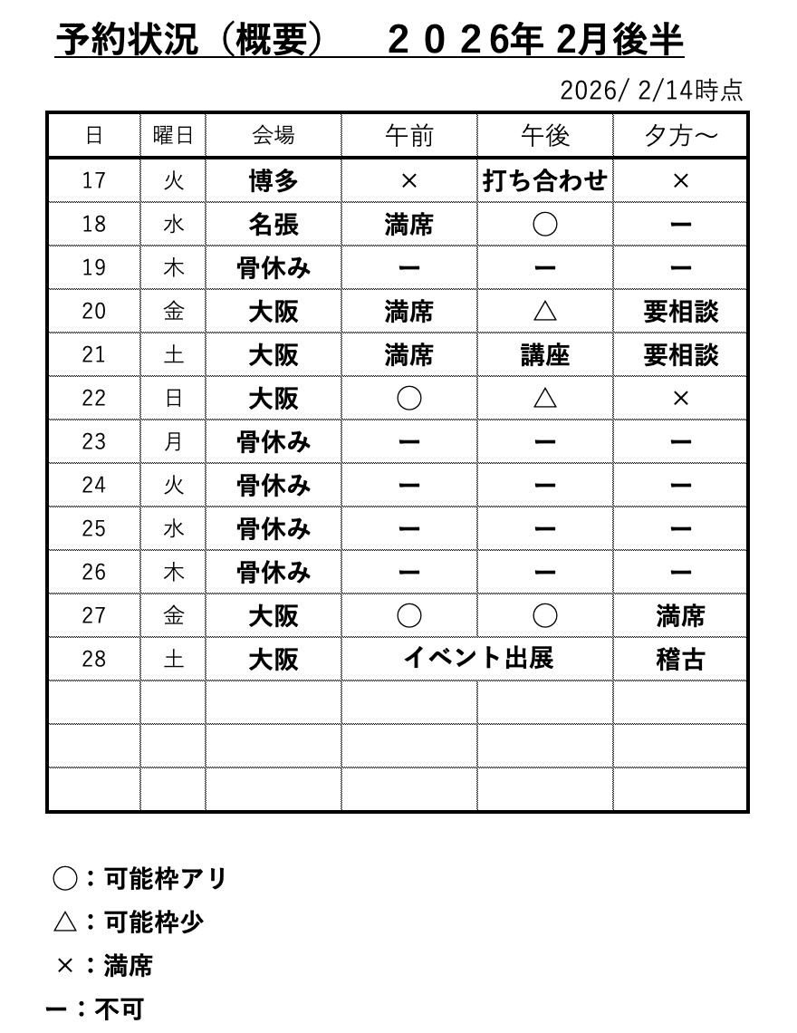大阪・名張日程2026.02.15予約状況一覧 2026/2月後半 共有:シェア Facebook で共有 (新しいウィンドウで開きます) Facebook X で共有 (新しいウィンドウで開きます) X