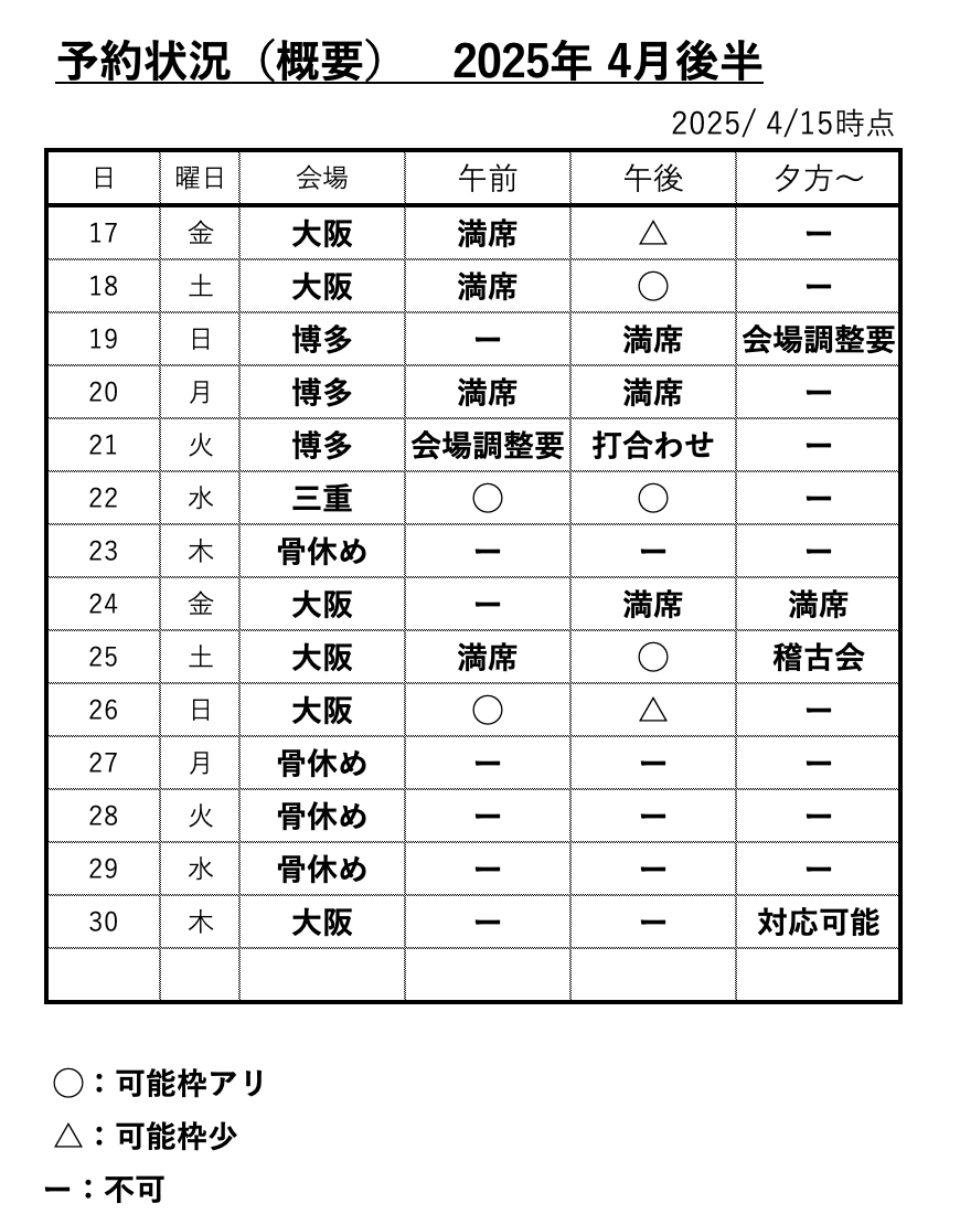 セッション日程2026.04.16予約状況一覧 2026/4月後半 共有:シェア Facebook で共有 (新しいウィンドウで開きます) Facebook X で共有 (新しいウィンドウで開きます) X